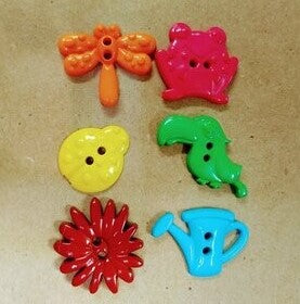 This package contains pink frog, orange dragonfly, yellow Lady bug, green bird, blue watering can, and red flower. These are plastic with 2 holes for attaching.